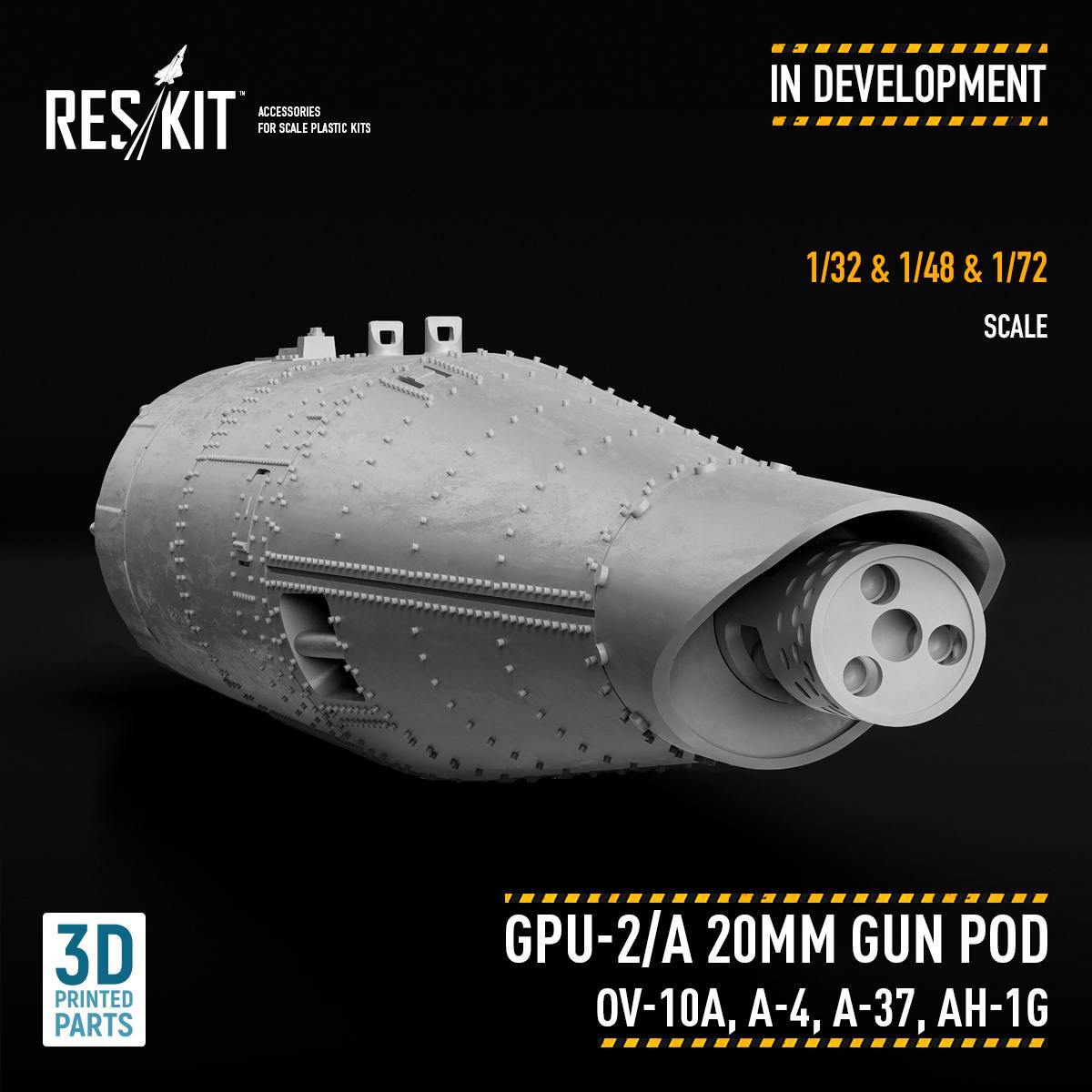 We are thrilled to announce an exciting new project currently under development by our innovative design team at ResKit: the GPU-2/A 20MM Gun Pod for the OV-10A, A-4, A-37, and AH-1G. This highly detailed set will be available in 1/32, 1/48, and 1/72 scales, perfect for enhancing your model kits with unprecedented accuracy and detail.