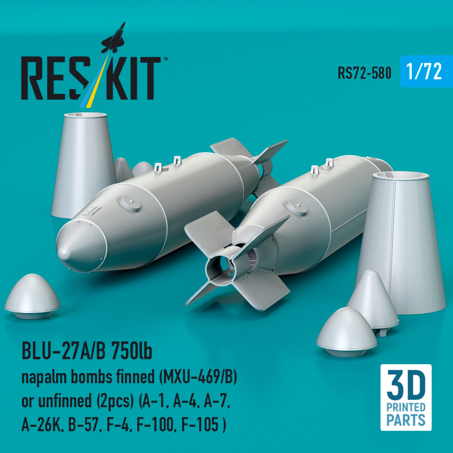 This set provides two finned and two unfinned BLU-27A/B 750lb napalm bombs for realistic load-outs on aircraft such as the A-1, A-4, A-7, A-26K, B-57, F-4, F-100, and F-105. Each bomb is intricately detailed and accurately scaled, ensuring an authentic look once assembled and painted. The 3D printed parts offer crisp lines and easy handling for modelers of all skill levels. Compatible with most mainstream 1/72 aircraft kits, they add depth to historical Vietnam War and Cold War projects. An excellent choice for those seeking historically accurate weaponry options.